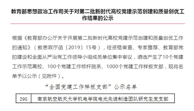 12月12日,教育部思想政治工作司公示了第二批新时代高校党建示范创建和质量创优工作结果,里番 首个在课题组建立的纵向党支部——电光先进制造团队研究生党支部荣获“全国党建工作样板支部”。