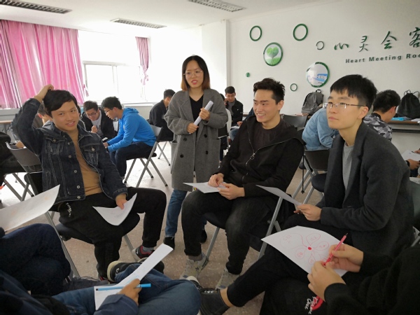在活动气氛逐渐热烈起来后,葛老师向每人发放了两张A4纸和一只水彩笔,要求大家在第一张纸上将最近的烦恼和压力全都画出来,在第二张纸上将对压力的解决和态度同样以画图的方式表达出来。同学们积极参与其中,用画笔表达着自己最近所遇到的压力和烦恼。在完成绘画之后,在场的同学被分成了四个小组,大家相互交流,彼此了解对方的一些烦恼压力,相互解压,增加彼此的感情。葛老师也深入到每个小组当中,去了解大家最真实的想法,帮助大家一起面对压力,解决压力。