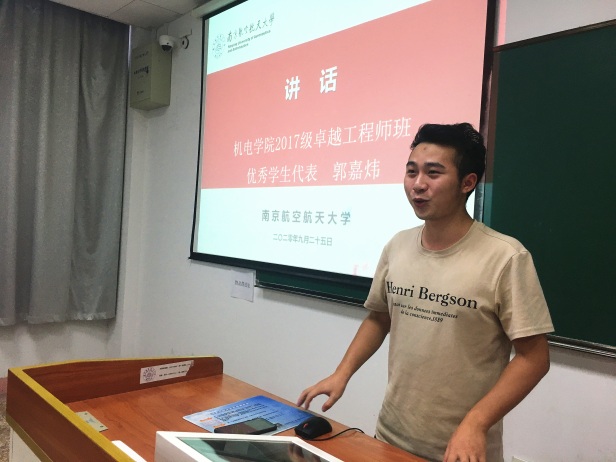 接下来,2017级“卓越班”优秀学生代表郭嘉炜同学结合“卓越班”注重实践培养的特点,为学弟学妹们详细介绍了“卓越班”的培养模式,分析了“卓越班”的优势,以学长的角度,为学弟学妹们提出了宝贵建议。
