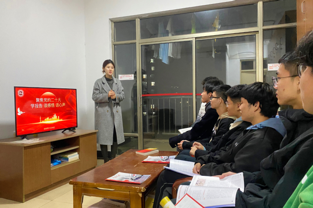 为深入学习贯彻党的二十大精神,营造奋进新征程的良好氛围。近日,里番 2021级团总支于怡园学生宿舍开展 “怡”起学习党的二十大,辅导员聂敏敏、王曦和二十余名学生代表参加了此次团课学习。
