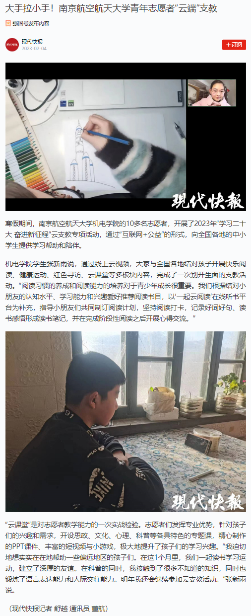 编者按:2月4日,学习强国专栏文章《大手拉小手!南京航空航天大学青年志愿者“云端”支教》报道里番 学子开展2023年“学习二十大 奋进新征程”云支教专项活动,通过“互联网+公益”的形式,向全国各地的中小学生提供学习帮助和陪伴,现转发全文如下: