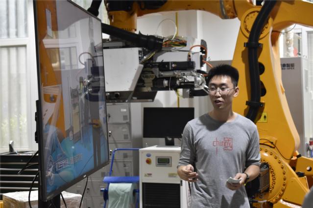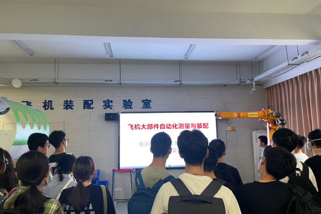 航空宇航制造工程系研究生李阳通过实验视频展示了机器人智能装配的过程,结合虚拟现实(VR)和增强现实(AR)的智能装配知识,增强了同学们对机器人智能制造的直观认识。随后,在飞机装配实验室中,李根老师为同学们详细介绍了飞机大部件自动化测量与装配的过程,实验室里高端的实验设备激起了不少同学对未来科研生活的向往。