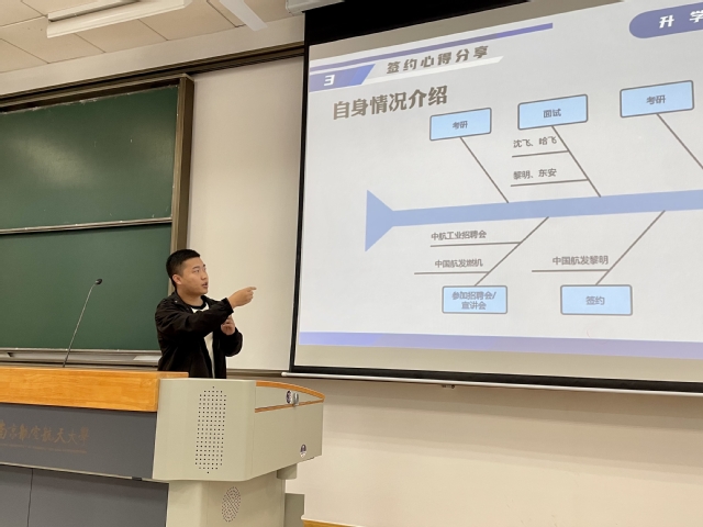 学院2024届本科生王成彬在秋招中签约中国航发沈阳黎明航空发动机有限责任公司,作为学生代表,从求职心理、求职准备和求职经历等几个方面进行了“干货”经验分享。他勉励同学们重视就业过程中个人求职技巧的应用,提升就业竞争力,获得企业青睐。