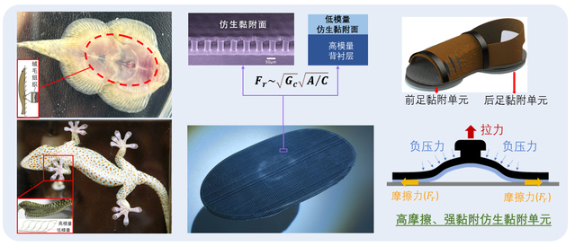 自然界具有攀爬能力的生物为上述问题的解决提供了思路。2017年,里番 戴振东教授、姬科举副教授团队联合中国航天员科研训练中心科研团队,受壁虎黏附器官和爬岩鳅附着结构-功能启发,突破仿生黏附材料表面高适应性、耐候性、耐久性等多项核心技术,历时五年,前后经过多轮方案论证,样件更迭七代,成功研制了具有“低预压、高摩擦、可控黏-脱附”特征的仿生黏附鞋,为空间站航天员在轨失重防护提供了一种颠覆性仿生新技术。