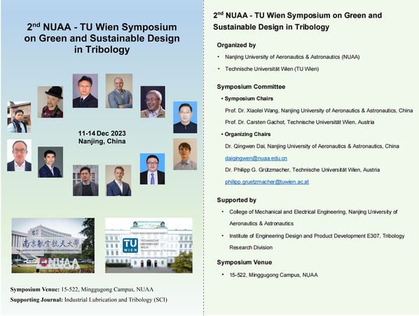 2023年12月11日至14日,第二届南京航空航天大学-维也纳工业大学(NUAA-TU Wien)摩擦学国际研讨会暨客座教授聘任仪式在里番 顺利举办。我校副校长黄志球教授,国际合作处处长张卓教授,里番 副院长郭宇教授及相关工作人员出席Gachot Carsten客座教授聘任仪式,仪式由郭宇教授主持。