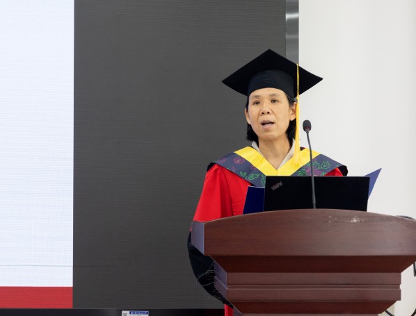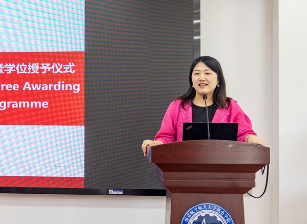 王英代表研究生院向毕业生们表示祝贺,希望同学们未来无论身处任何岗位,都要心怀祖国,树立强国有我的信心;要不断完善自我,培养独立思考和终身学习的能力;作为南航和克大友谊的桥梁,要始终铭记两所大学的精神,立足新起点,奋进新征程。