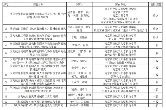 根据《关于发布2024年度工业和信息化部“十四五”规划航空航天领域智能制造教材建设重点研究基地开放课题的通知》要求,经个人申报,各高等院校、科研院所和重要企业单位推荐,学院专家组评审,拟立项以下13个项目,其中重点项目3项,一般项目10项,现予以公示。排名不分先后,名单如下: