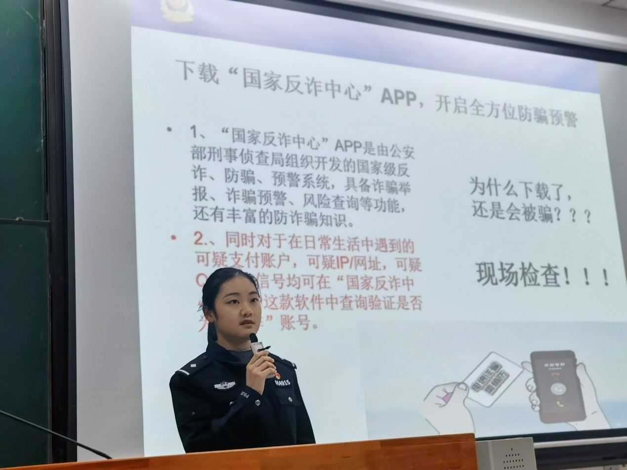 江警官向里番 研究生讲解电信网络诈骗的常见手段和防范方法,并结合辖区及校园电信网络诈骗高发案件,现场以案释法,详细讲解电信网络诈骗的新形势、新特征,引导同学们了解最新诈骗套路,提高自我防范意识,并呼吁班长、安全员等学生干部共同参与到预防电信诈骗工作中,积极宣传预防电信网络诈骗知识,营造师生共同抵制电信网络诈骗的良好氛围。
