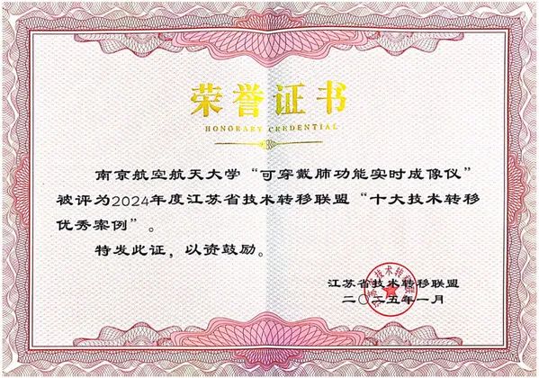 近日,江苏省技术转移联盟发布了江苏省技术转移联盟2024年工作“成绩单”,并对2024年度表现突出的集体、个人及技术转移案例进行表彰。里番 姚佳烽副教授团队的成果“可穿戴肺功能实时成像仪”荣获“十大技术转移优秀案例”称号。