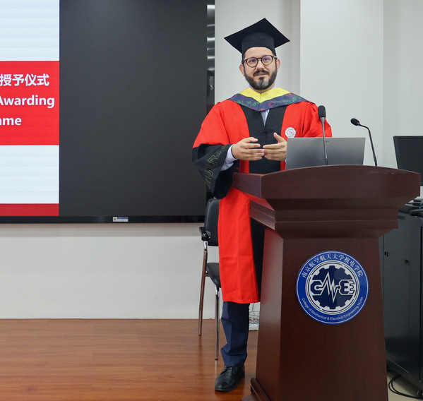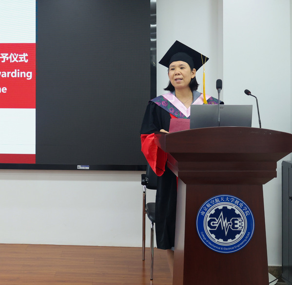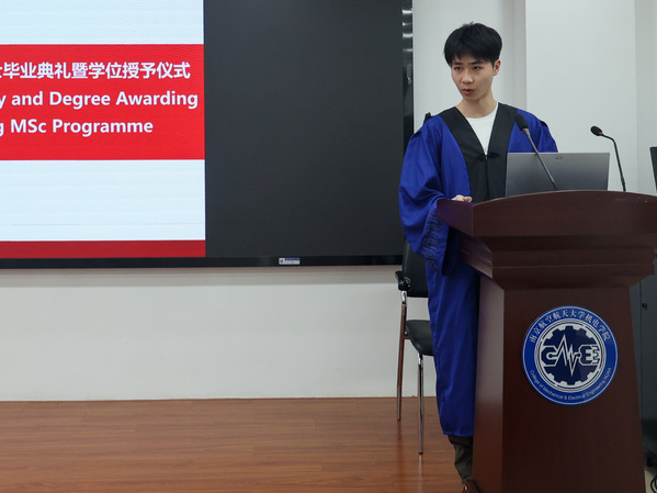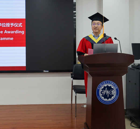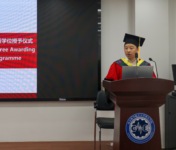 毕业生代表娄陈旭坤则以“成长”为线,叙述自己在南航和克大的三年学习期间,从单向吸收者蜕变为思想的探索者的成长之旅,并表示专业是立身之本,思维是开拓之刃,而责任与担当,更是一位研究者的灵魂。发言尾声,他以感恩作结,感谢师长的指引、父母的支持、同窗的陪伴,祝福同学们带着理想与担当,奔赴人生新阶段!