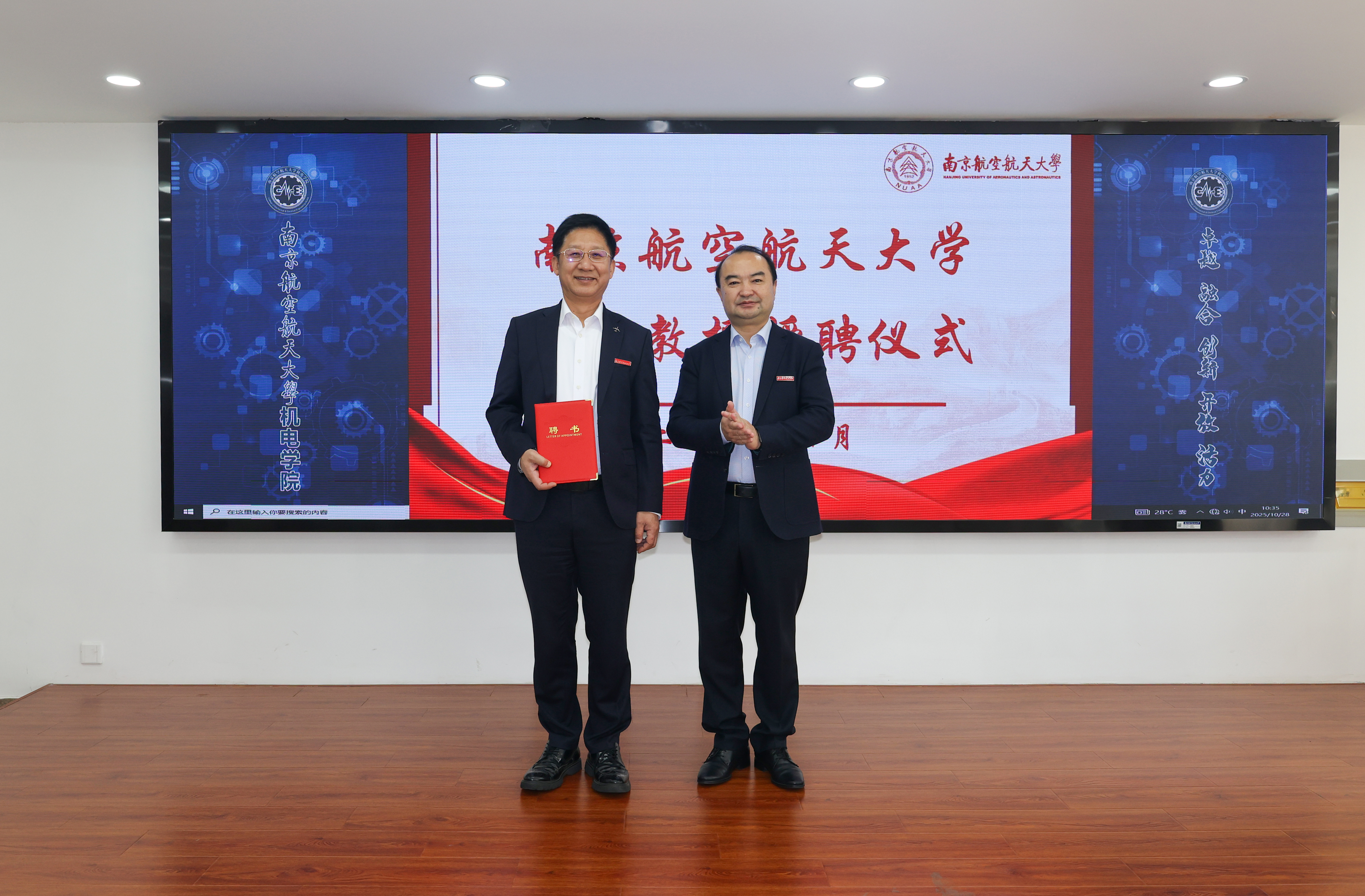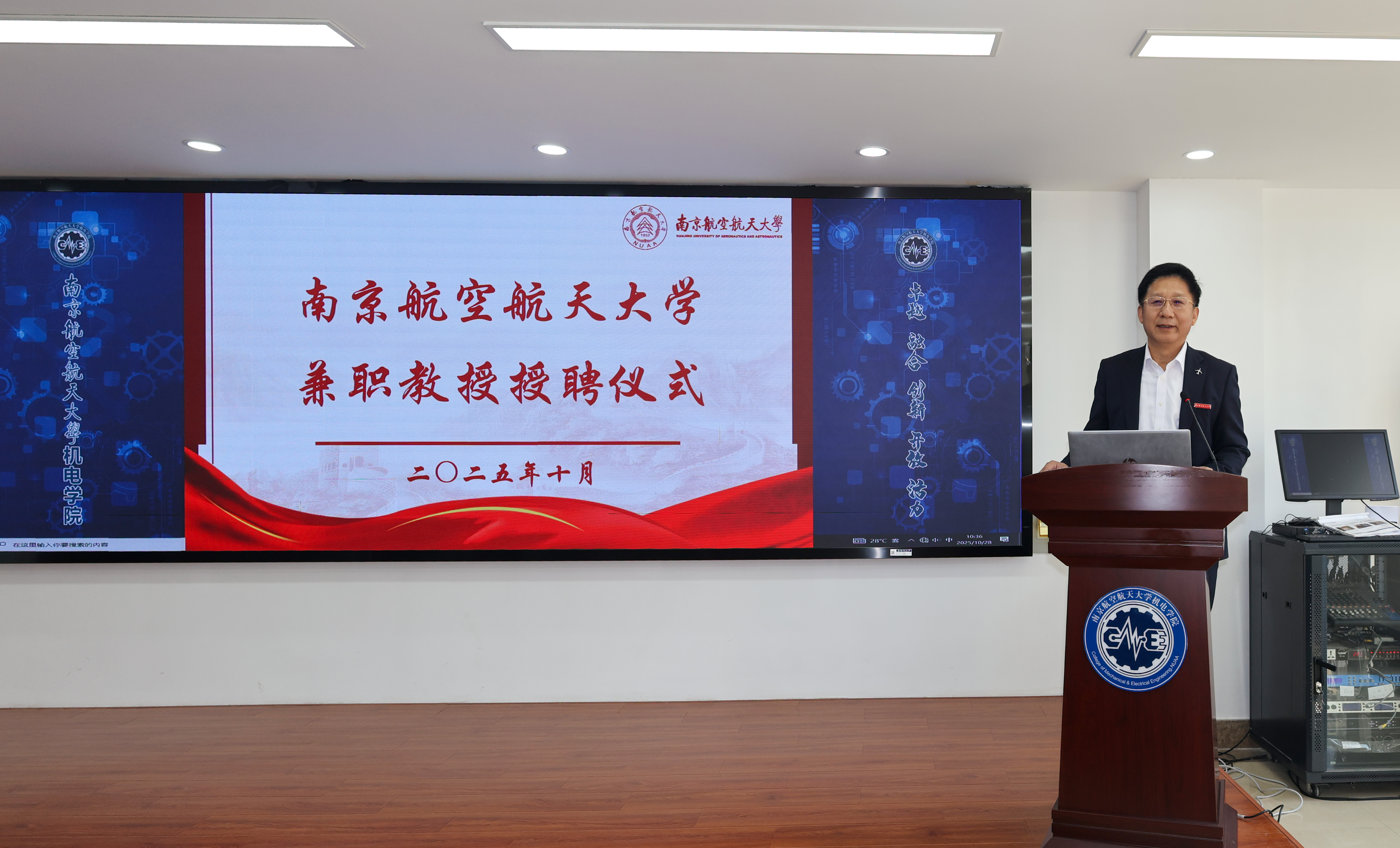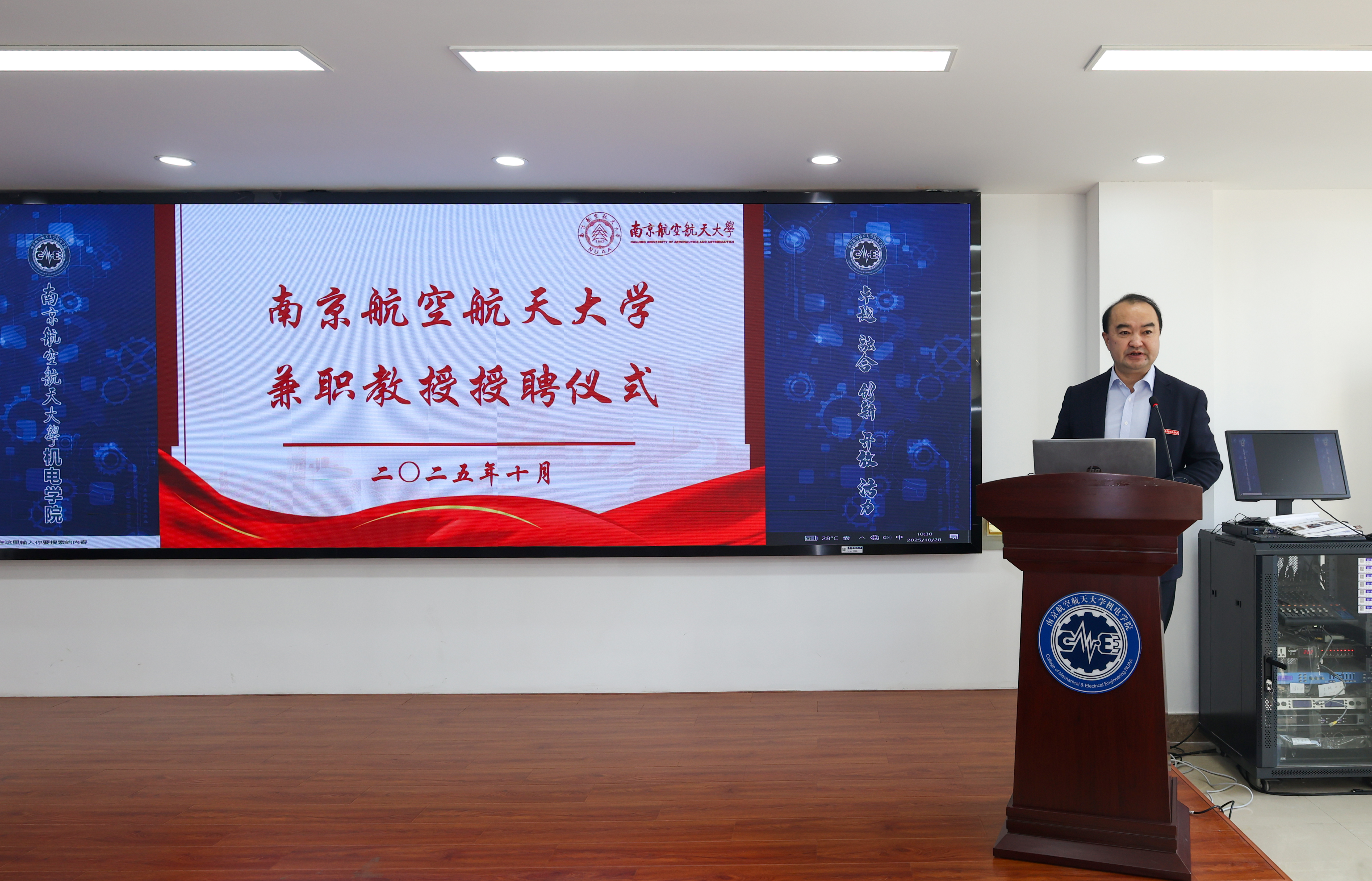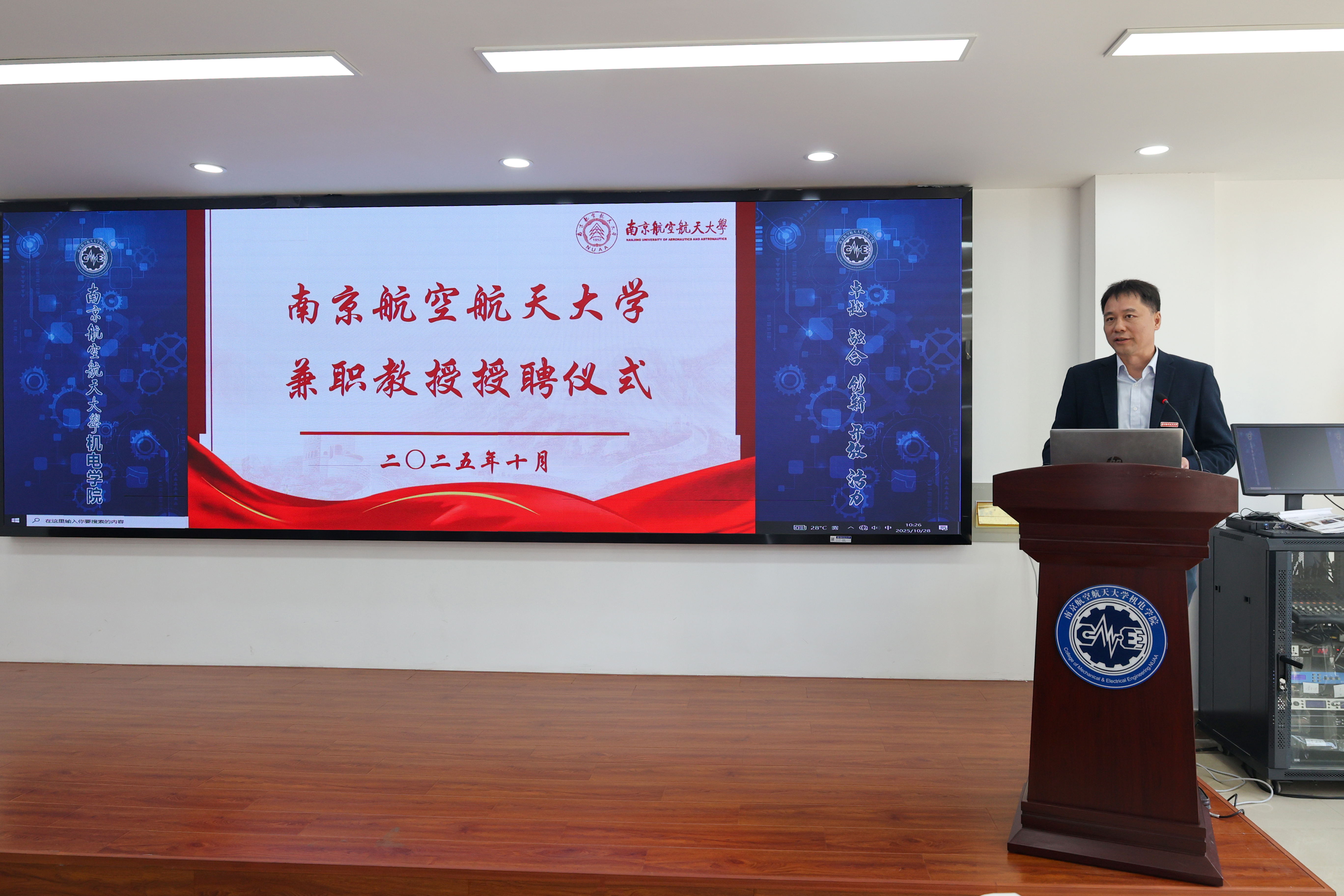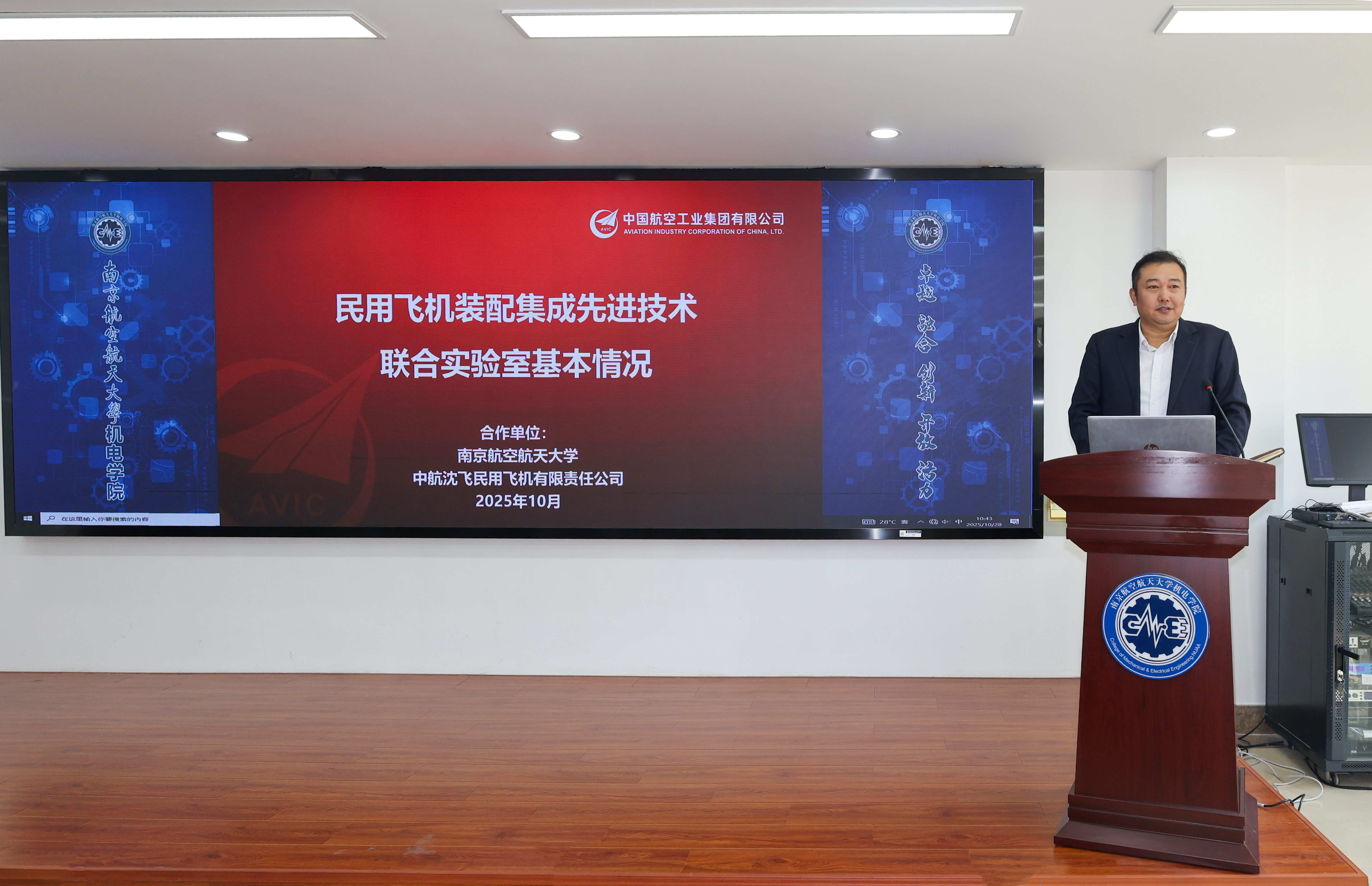 10月28日,我校在明故宫校区举行邓玉东研究员兼职教授授聘仪式暨“民用飞机装配集成先进技术联合实验室”揭牌仪式。1987级校友、中航沈飞民用飞机有限责任公司(以下简称“沈飞民机”)党委书记、董事长邓玉东,副总工程师杨波,规划发展部部长戴天,制造技术副总工程师贾晓亮,供应链管理部副部长赵敏,我校党委副书记陶勇、发展规划与学科建设处处长田威、科学技术研究院专务梁文萍、人才办公室副主任赵海燕以及里番 党委书记刘虎、党委副书记赵铮等多名师生代表参加仪式。仪式由刘虎主持。