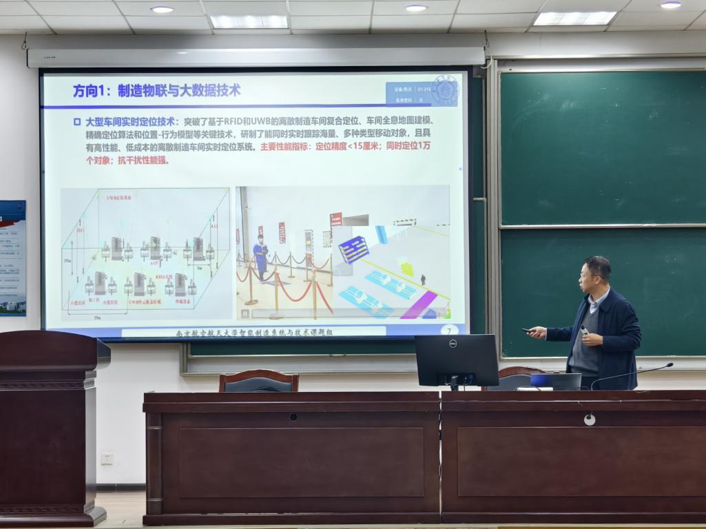 随后,他首先以飞行器制造工程专业负责人的视角,为同学们指明了专业学习的基础方向。同时,作为智能制造系统与技术课题组负责人,他还向同学们展示了课题组在制造物联与大数据技术、制造系统数字孪生技术、AR+具身智能系统、智能工艺规划技术等四个前沿方向的研究进展,生动呈现了智能制造领域的广阔发展前景,激发同学们的科研兴趣与专业热情。